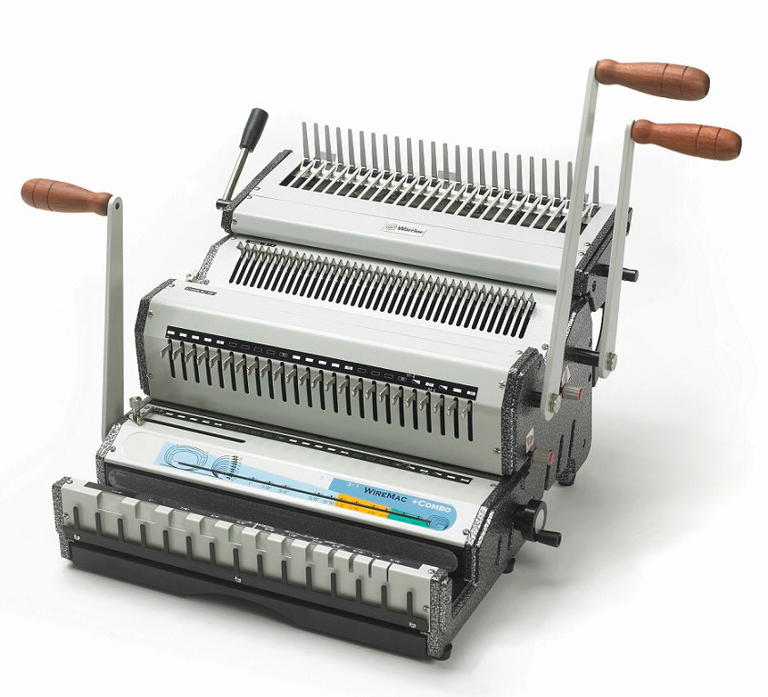 Manuelle, kombinierte Bindemaschine, für Plastikbinderücken 21 Ringe U.S.-Teilung (14,28 mm) & für Drahtbinderücken 34 Ringe 3:1-Teilung (8,467 mm), stanzt bis zu 15 Blatt 80 g / m², bindet bis zu 500 Blatt 80 g / m² Plastikbinderücken und bindet bis zu 120 Blatt 80 g / m² Drahtbinderücken, seitlich offene Stanzkanäle für größere Papierformate und Kalenderproduktion, einstellbarer Papier-Seitenanschlag, einstellbarer Papier-Tiefenanschlag (2-5 mm), großvolumiger herausnehmbarer Sammelbehälter für Stanzabfall, 4 Hebel zur einfachen Bedienung, mit Drahtaufhänge-Vorrichtung, individuell ausschaltbare Stanzmesser, geräuscharme Stanzung, stabile Metallausführung, Plastik-Lochung rechteckig (7,94 x 3,12 mm) & Draht-Lochung viereckig (4 x 4 mm).